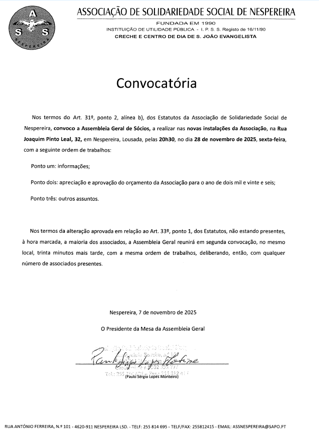 A pedido da Direção, convocamos os Associados a reunir-se em Assembleia Geral, no dia 28 de novembro de 2025 (sexta-feira), pelas 20h30, na sede da Associação de Solidariedade Social de Nespereira (Rua Joaquim Pinto Leal nº 32 4620-906 Nespereira Lousada).
